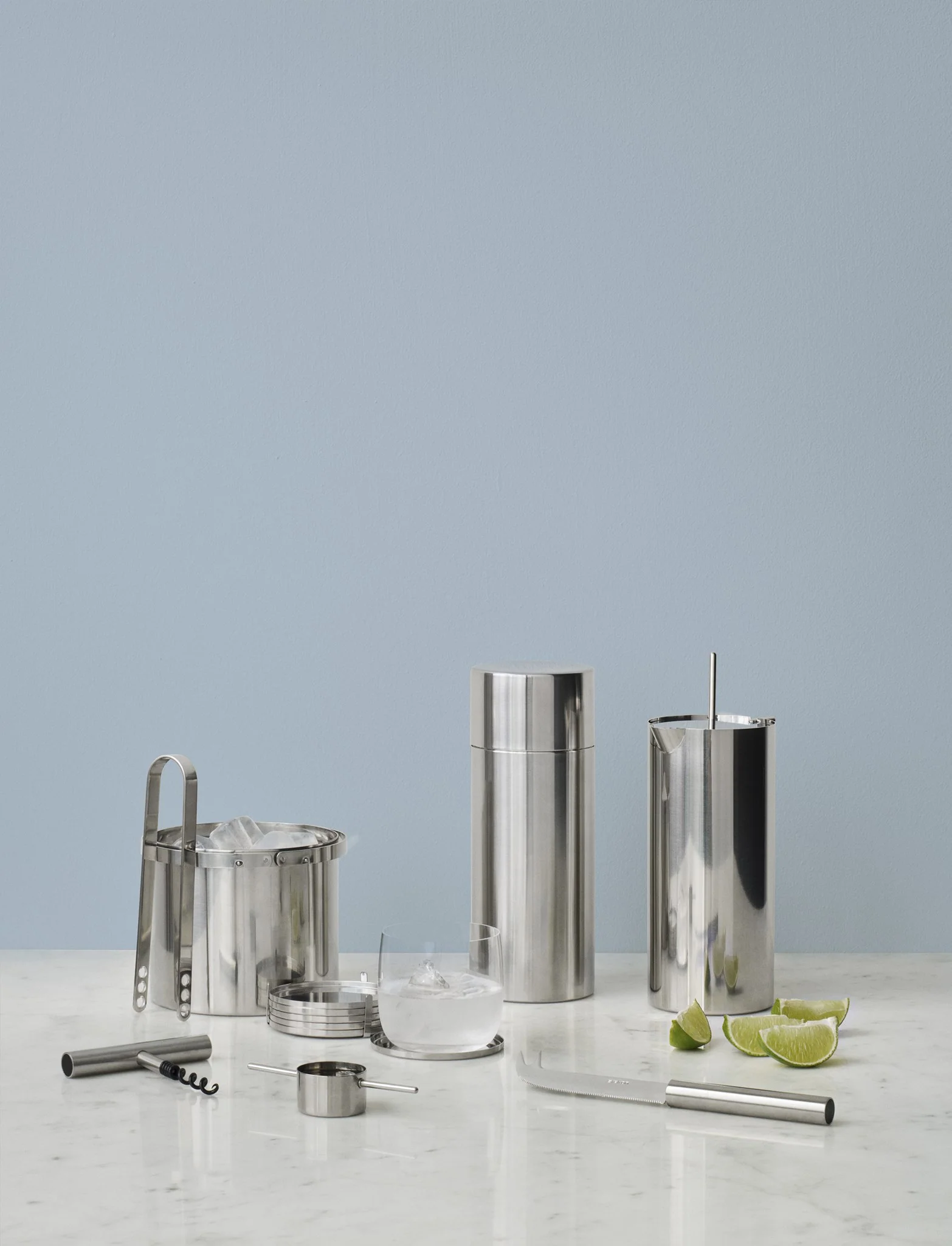 Cylindrical elegance for your glass with this set of glass coasters designed by Arne Jacobsen. The set comprises six glass coasters and a discreet holder where the coasters can be stacked when not in use. The coaster are made of stainless steel and has a diameter of 8.5 cm. Always use them to avoid drips and glass rings on the table.